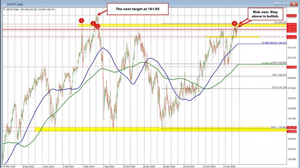 Der USDJPY ist deutlich über den gestiegen 160,00 Niveau, das bis zu einem Höchstwert von reicht 160,29. Dabei bewegte sich das Paar kurzzeitig über einen wichtigen Swing-Bereich ab 2024 nahe 160,25aber dem Break mangelte es an Durchhaltevermögen, und der Zug schaffte nur ein paar Punkte über die Zone hinaus, bevor er ins Stocken geriet. Dieses Zögern gegenüber einem früheren mehrjährigen Referenzpunkt ist erwähnenswert – die Käufer machten einen Ansturm, zeigten aber noch nicht die nötige Überzeugung, um den Trend zu beschleunigen.