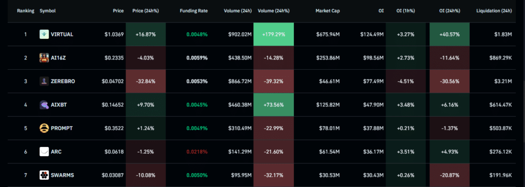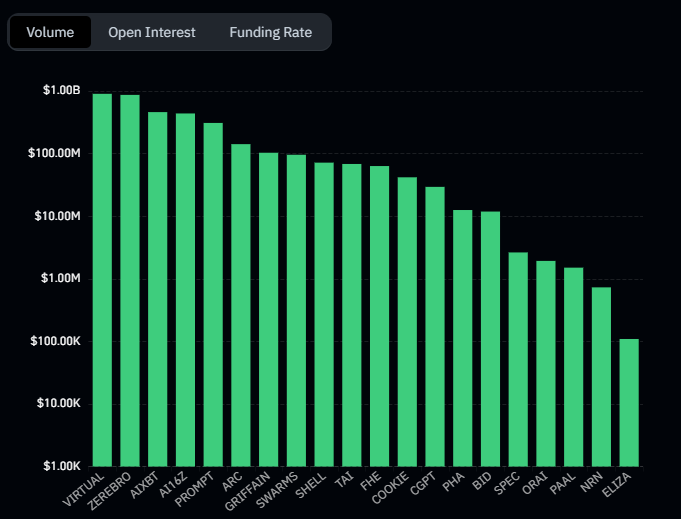 Entsprechend zeigen Daten von Coinglass, dass die Top 10 AI -Agenten -Token Volumina im Wert von 680 Mio. USD und 900 Millionen US -Dollar hatten, mit Virtuell [VIRTUAL] dominieren die Liste.