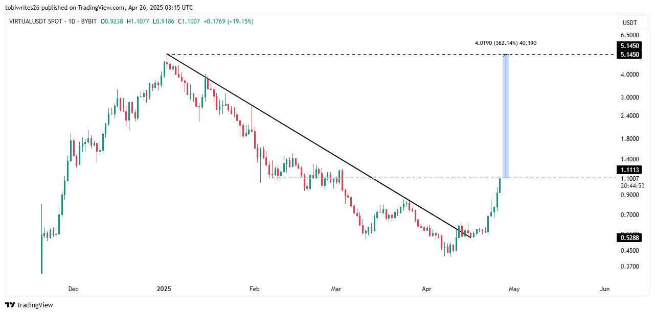 Ziele zeigen, dass, wenn virtuell das Widerstandsniveau von 1,11 USD überschreitet, eine weitere Rallye von 362% in Richtung 5,14 USD in Reichweite sein kann. Der Grund für diesen Sprung kommt, nachdem virtuell ein bullischer absteigender Widerstandsweg verletzt wurde, typischerweise einen Rallye -Vorläufer.