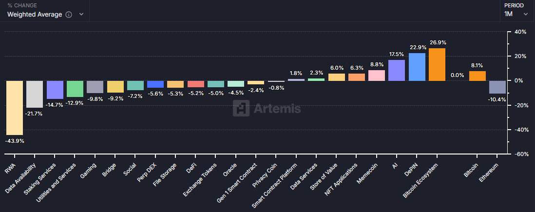 Daten von Artemis zeigen, dass der KI -Sektor im vergangenen Monat 17,4% gewachsen ist, was ihn zum zweithäufigsten Sektor hinter Depin und dem Bitcoin -Ökosystem ist.