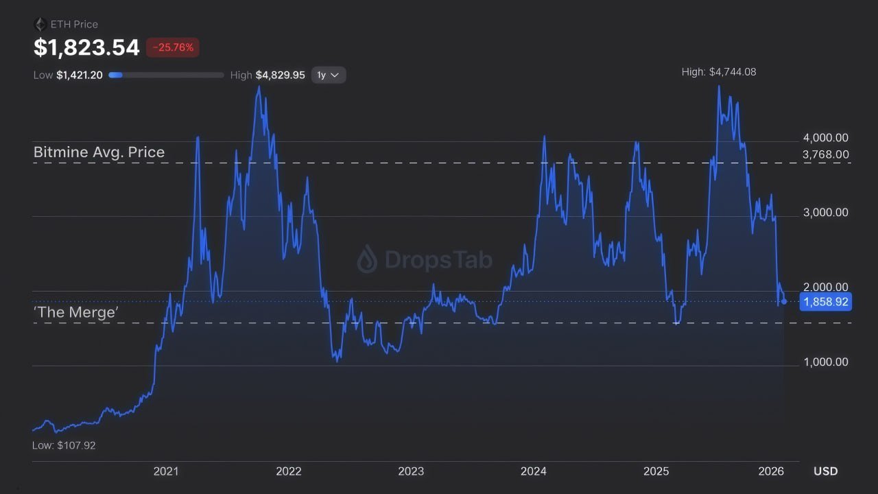 Der Rückgang hat auch die Ether-Treasuries der Unternehmen hart getroffen. Es wird geschätzt, dass Bitmine Immersion Technologies einer der größten Unternehmens-ETH-Inhaber ist Milliarden an unrealisierten Verlusten mit sich bringen da der Token innerhalb von sechs Monaten um etwa 60 % fiel und damit weit unter seinen durchschnittlichen Kaufpreis fiel.