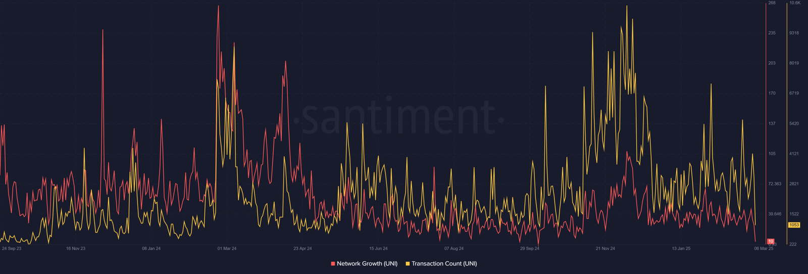 Das Netzwerkwachstum und die Transaktionszahl verzeichneten erhebliche Rückgänge. Die neuesten Daten zeigen nur 10 neue Adressen, die sich dem Netzwerk anschließen. Zusätzlich bleibt die Transaktionszahl bei 1.053 niedrig.