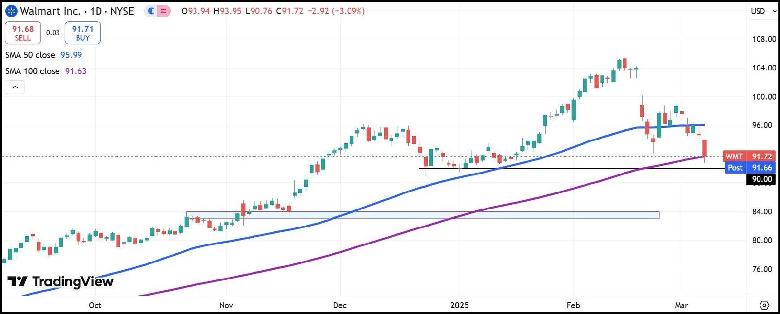 Während die meisten Namen im Dow Jones Industrial Average (DJIA) in der Sitzung gewonnen haben, Walmart (WMT) war ein bemerkenswerter Ausreißer, da er unter allen Indexmitgliedern am schlimmsten war. Die WMT -Aktie hat am Freitag 3,1% und beendete die Sitzung mit 91,67 USD.