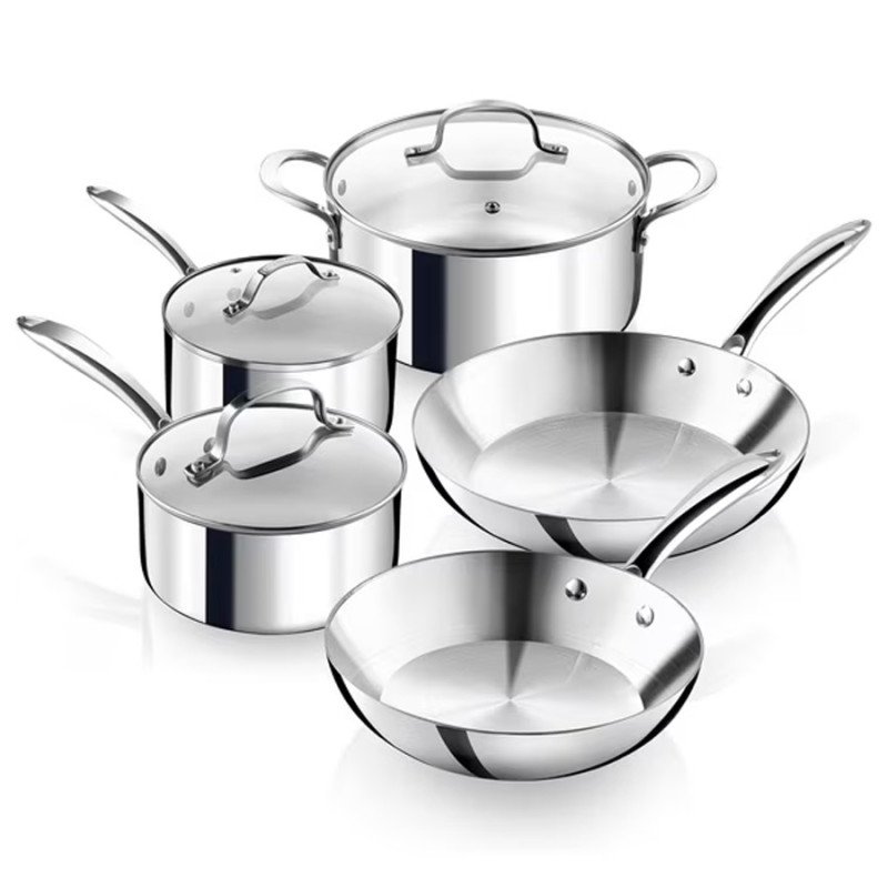 Dieses Set besteht aus einer 8-Zoll- und einer 10-Zoll-Bratpfanne mit hohem Rand, einem 1,5-Liter- und einem 2,5-Liter-Kochtopf mit Deckel, einem 5,0-Liter-Suppentopf mit Deckel und zwei 16,5-Zoll-Pfannenschutzvorrichtungen, sodass Sie Ihre Pfannen auf der Theke abstellen oder zum Servieren auf dem Esstisch verwenden können, ohne die Oberflächen zu beschädigen. Jedes Teil ist aus Edelstahl gefertigt und verfügt über einen dreischichtigen Boden, der für zusätzliche Haltbarkeit und gleichmäßige Wärmeverteilung sorgt, sodass Sie Lebensmittel gleichmäßiger garen und Steaks, Braten von Fleisch oder Gemüse einfacher anbraten können.