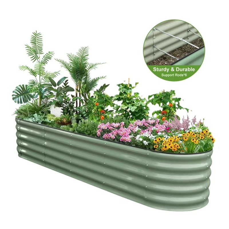 Dieses 17-Zoll-Gartenbett besteht aus einer stabilen, wetterfesten Zink-Aluminium-Magnesium-Stahllegierung und verfügt über eine Kapazität von 28,6 Kubikfuß, was eine felsenfeste Fundament für ein kleines Gartenprojekt bietet. Die glatte ovale Form sieht gegen jede vorhandene Landschaftsgestaltung, die Sie möglicherweise bereits haben, attraktiv und natürlich aus. Sie haben eine olivgrüne Farbe gestrichen, die sich gut für einen kleinen Gemüse- oder Obstgarten eignet.