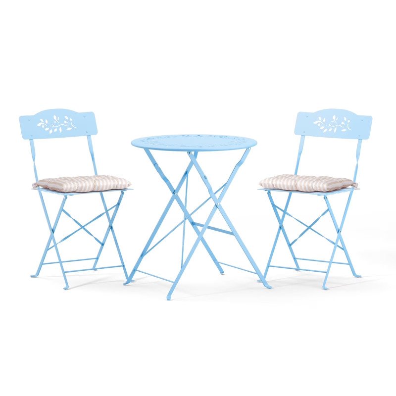 Wir wissen, was Sie denken: Wie komfortabel kann eine Terrassengarnitur aus Metall sein? Nun, jeder Stuhl wird mit einem weichen Kissen geliefert, das mit Bändern an jedem Sitz befestigt wird. Die Kissenbezüge sind gestreift und bilden so einen schönen Kontrast zu den vier verfügbaren Farbvarianten. Sie können das Set in Schwarz erhalten, aber die Pastelltöne Blau, Grün und Rosa wirken fast schon im Retro-Stil. Jede Wahl würde Ihren Außenbereich verschönern.