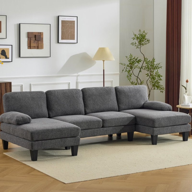 Mit einer Länge von 111,4 Zoll, einer Breite von 48,4 Zoll und einer Höhe von 33,1 Zoll hat dieses Sofa eine U-Form mit längeren Chaiselongues an jedem Ende, die sich perfekt zum Zurücklehnen oder Faulenzen in voller Länge eignen, während der mittlere Teil über eine traditionelle Sitzecke verfügt. Diese kürzeren Sitzbereiche sind 20,9 Zoll lang und 16,5 Zoll lang und bieten zusammen mehr als genug Platz für vier Personen gleichzeitig.