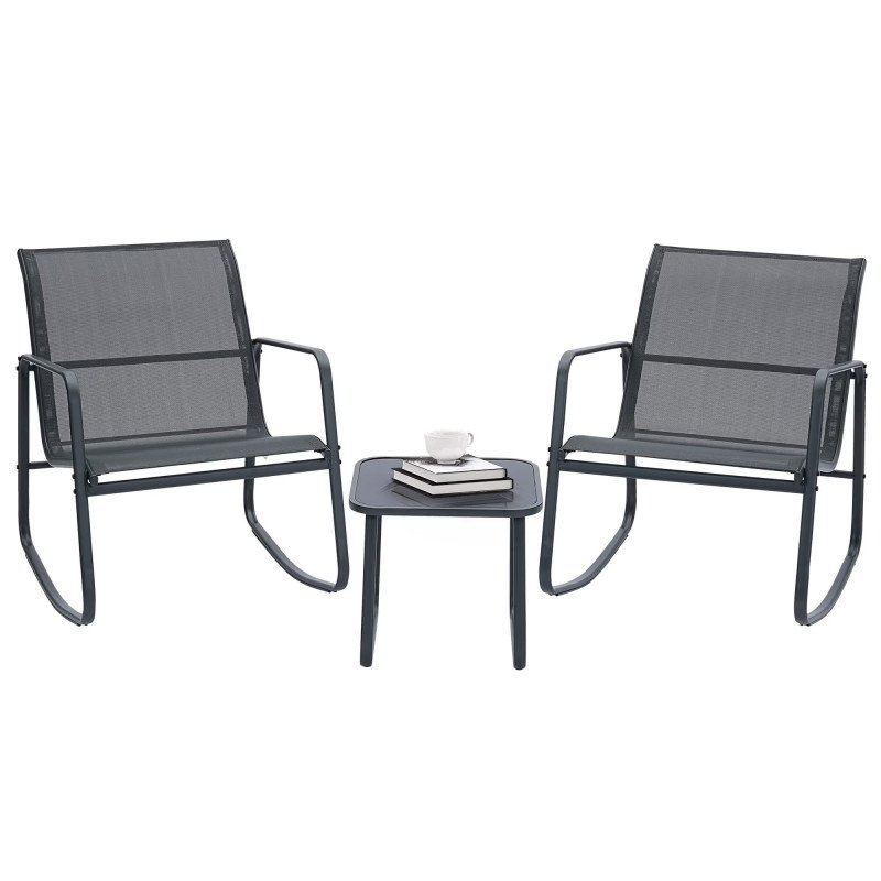 Nicht alle Terrassenmöbel sind gleich, und das ist gut so. Während einige Outdoor-Sitzgarnituren aus billigen Materialien hergestellt werden und Wert auf Komfort gelegt wird, ist diese Garnitur genau das Gegenteil. Dieses aus langlebigem und rostfreiem, pulverbeschichtetem Edelstahl gefertigte dreiteilige Set, bestehend aus zwei Schaukelstühlen und einem Beistelltisch, hält der Zeit und dem Wetter stand. Der bequeme Textilene-Stoff, der die Stühle bedeckt, ist atmungsaktiv und gerade fest genug, um Halt zu bieten, ohne steif zu sein.