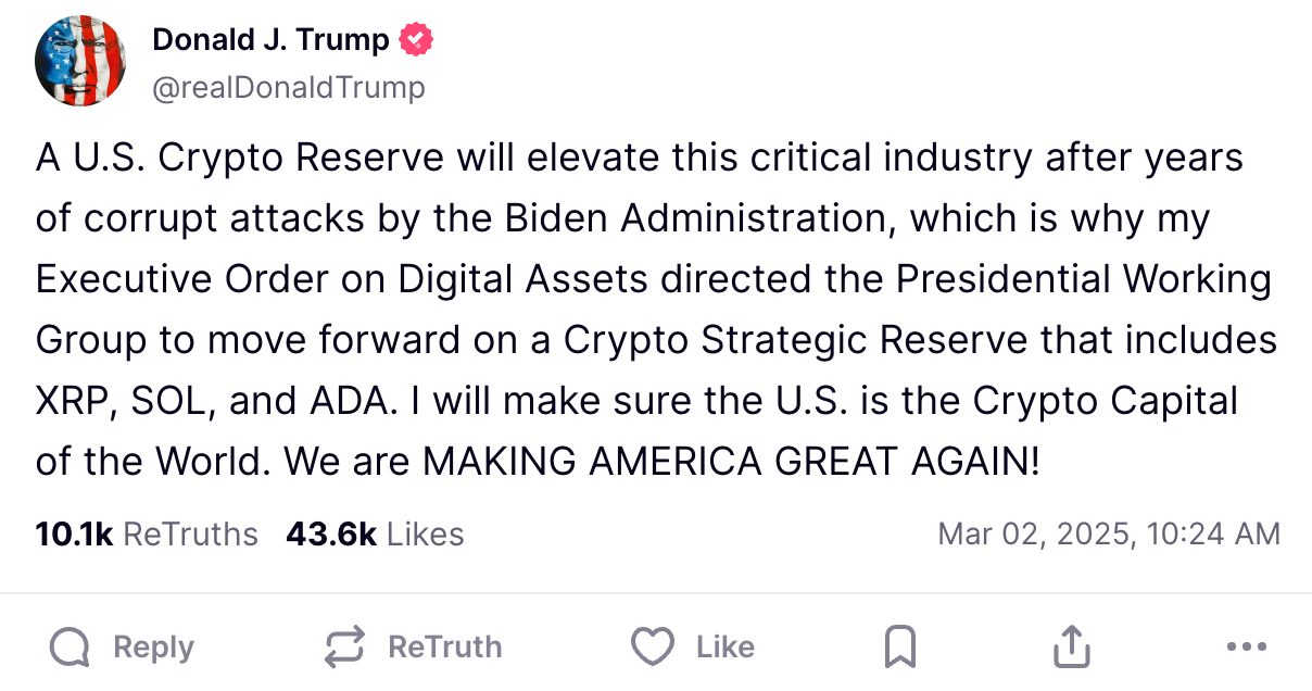 Es ist zwar unmöglich, sicher zu wissen, aber es scheint, dass diese Gesten warme Gefühle unter dem inneren Kreis von Maga inspiriert haben. Im Februar folgte Trumps Sohn Donald Trump Jr. Ripple auf X. Am 2. März nannte Trump XRP als eine von fünf Kryptowährungen in eine strategische Krypto -Reserve aufgenommen werden.