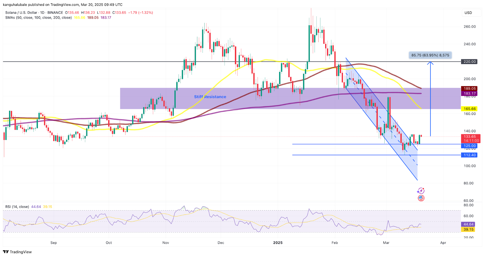 Sol handelt immer noch weit unter dem Reichweite von 220 US -Dollar, das am 5. Februar erreicht wurde. Die Bullen haben jedoch an der oberen Grenze eines absteigenden Kanals rund 110 USD und 125 US -Dollar eingerichtet.
