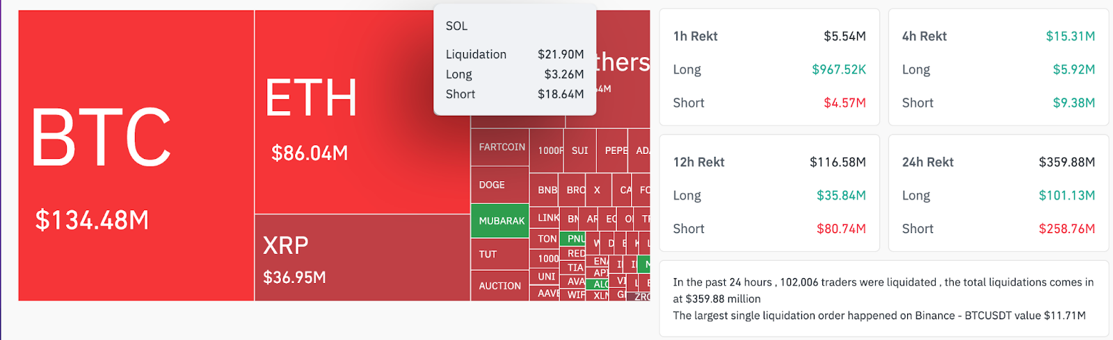 Der Krypto -Futures -Markt erlebte in den letzten 24 Stunden die Liquidation von Hebelpositionen im Wert von über 359 Millionen US -Dollar. 258,7 Millionen US -Dollar waren kurze Liquidationen.
