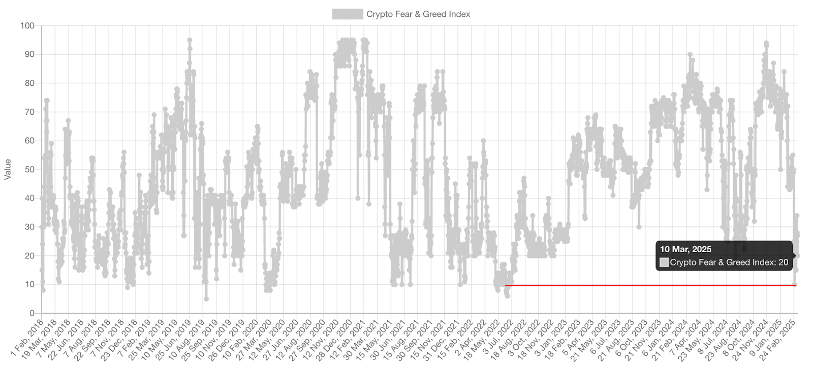 Darüber hinaus fiel der Krypto Fear & Greed Index am 10. März auf 10, der niedrigste seit Juli 2022, was auf „extreme Angst“ hinweist.