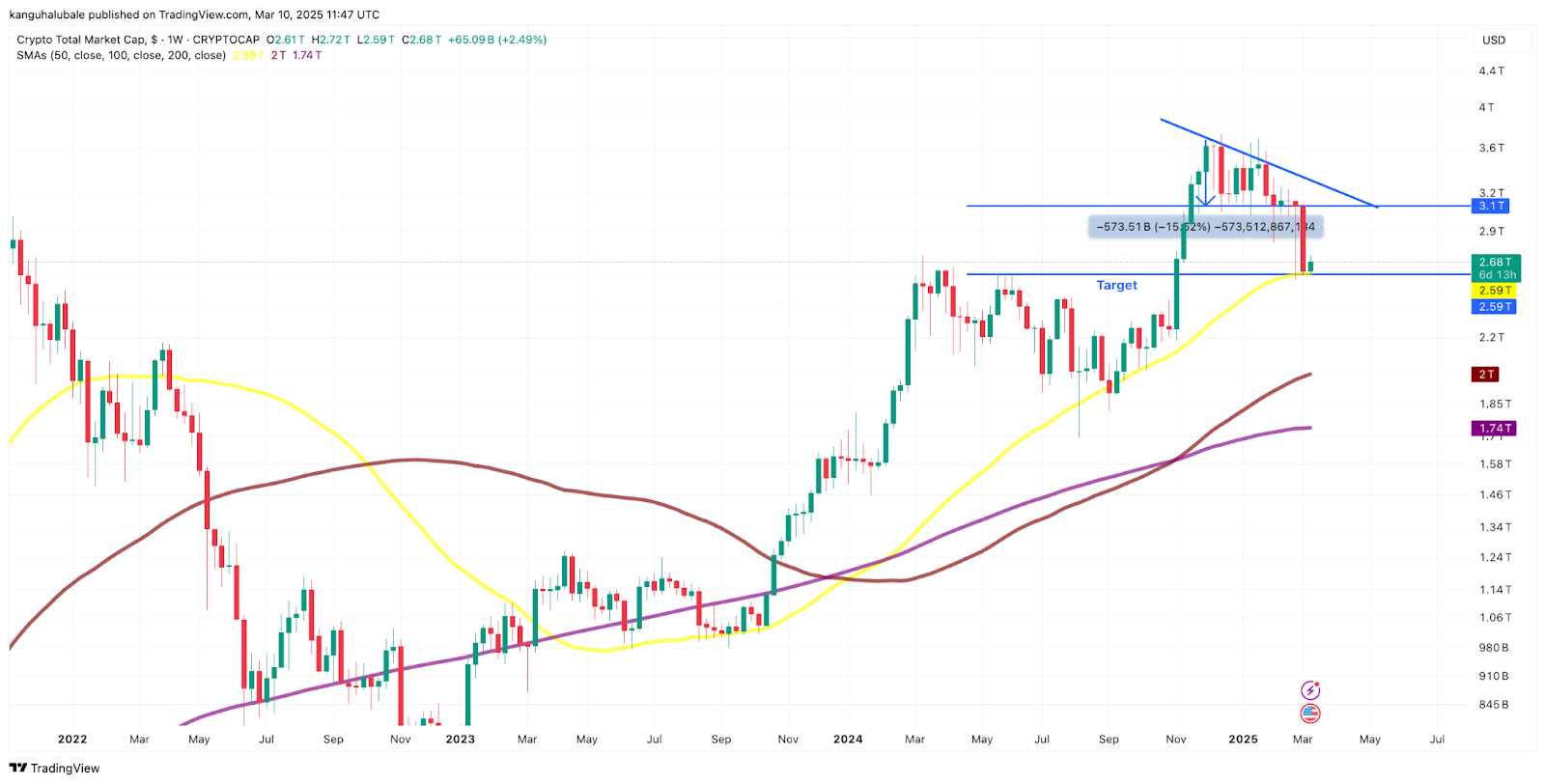 Wenn der Verkaufsdruck bestehen bleibt, könnte die 100 -Woche -SMA bei 2 Billionen US -Dollar zum nächsten Abwärtsziel werden.