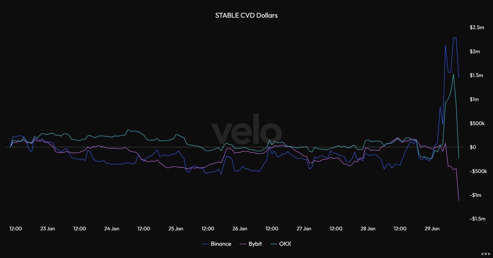 Laut Futures Cumulative Volume Delta (CVD), das den gesamten Kauf- und Verkaufsdruck misst, sind OKX und Bybit stark in den negativen Bereich gefallen. Dies bedeutete, dass Benutzer an den beiden Börsen den Token aggressiv verkauften.