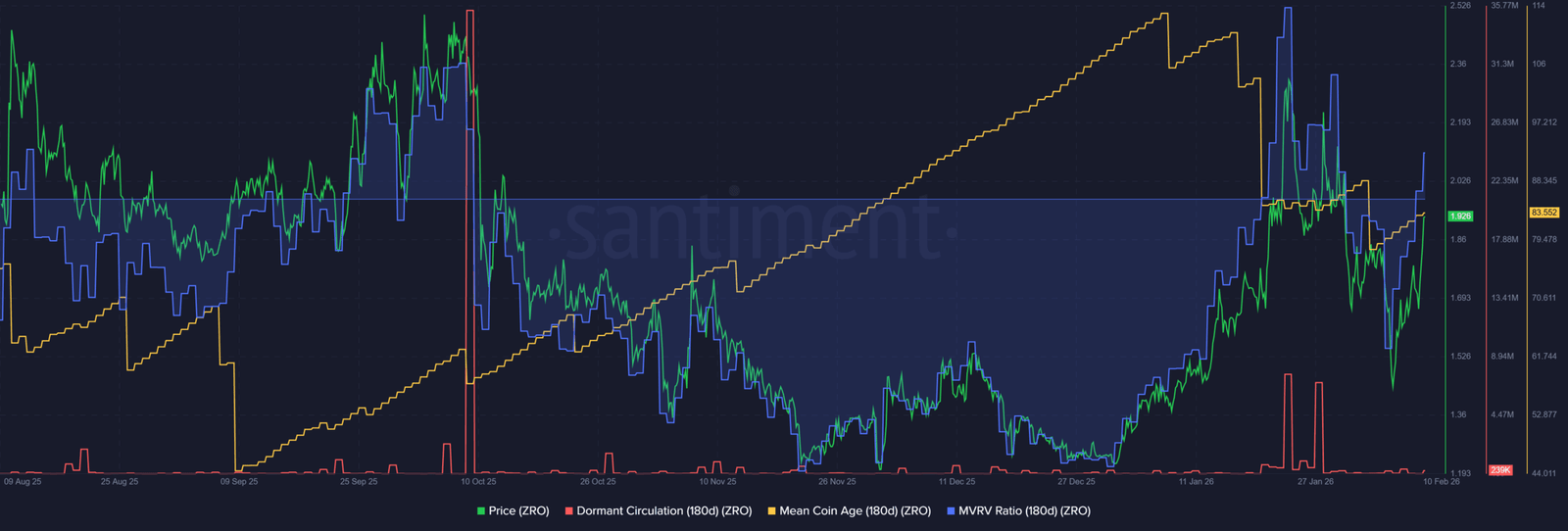 Darüber hinaus lag die 180-Tage-MVRV-Quote wieder im positiven Bereich. Es zeigte sich, dass ZRO-Käufer in den letzten sechs Monaten im Durchschnitt einen Gewinn von 6 % erzielten. Der Retracement von der 2,39-Dollar-Marke führte dazu, dass der MVRV 24,75 % erreichte.