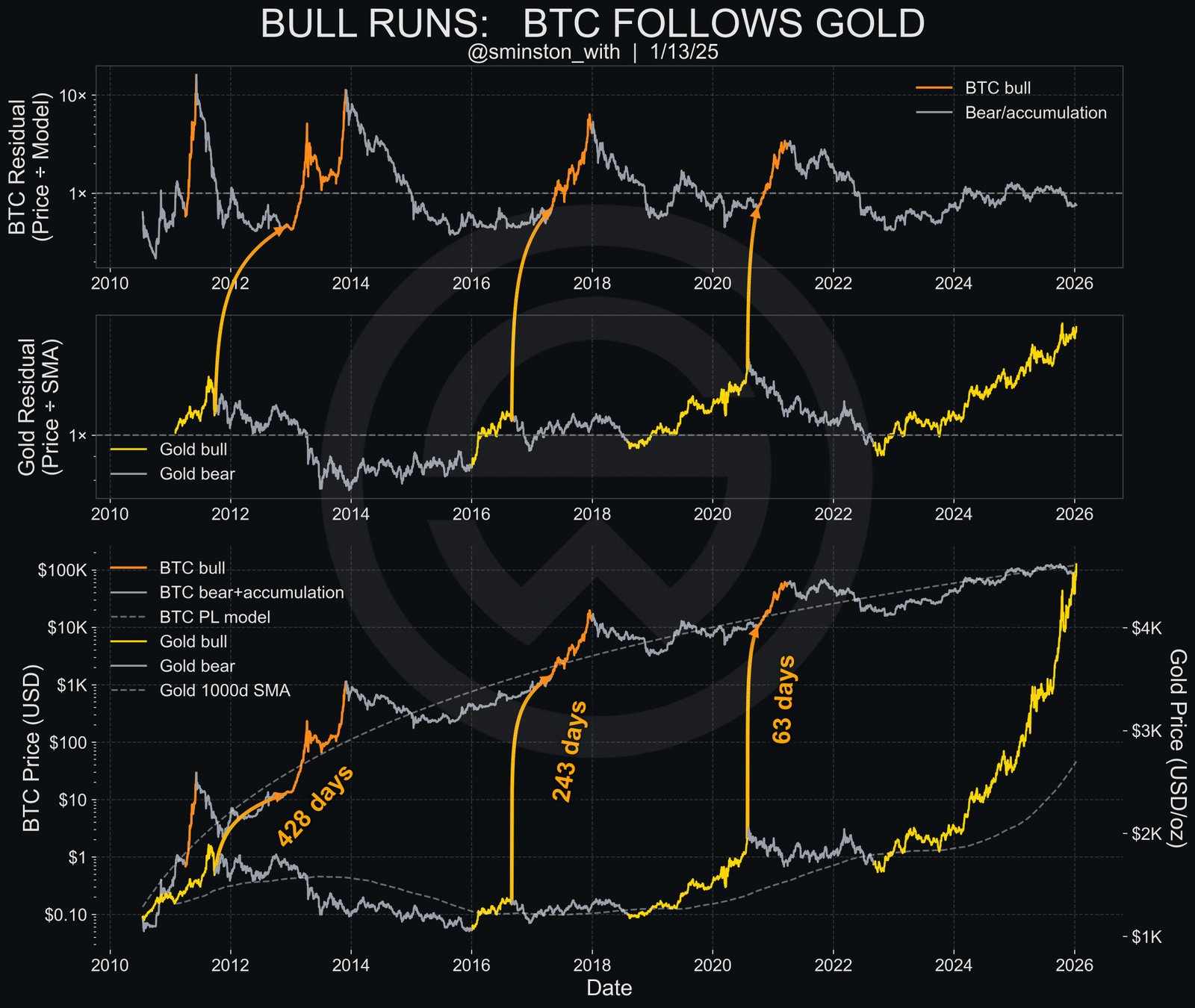 Darüber hinaus legen historische Daten dies nahe Die stärksten Preisausweitungen von Bitcoin folgen tendenziell den Gold-Bullenmärkten.