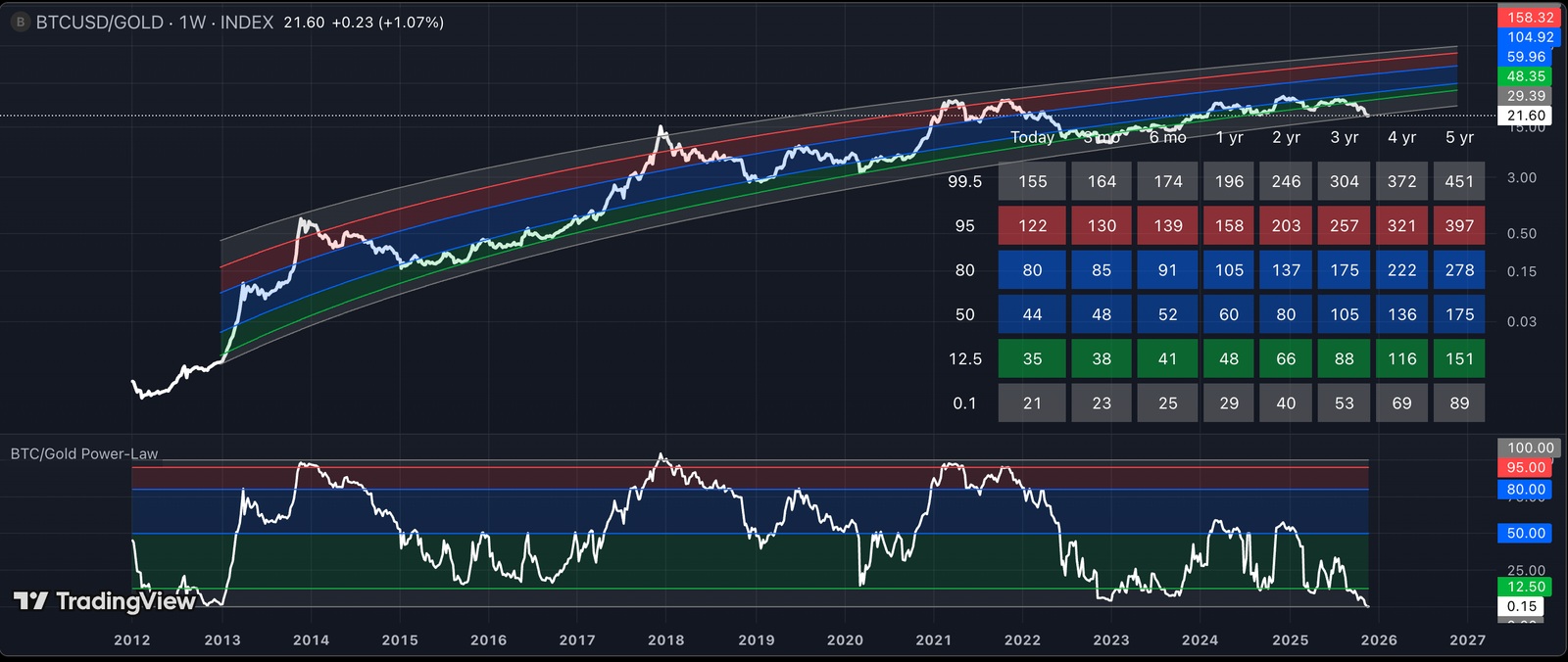 Historisch gesehen gingen Bewegungen des BTC/XAU-Verhältnisses in Richtung der Standardabweichungszone von −2 längere Zeiträume voraus, in denen Bitcoin Gold übertraf, wie in der Abbildung gezeigt Power-Law-Bänder Grafik unten.