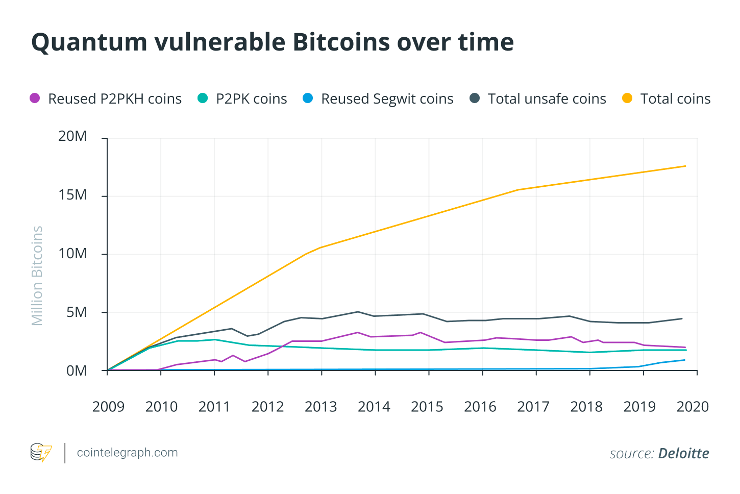 Weitere 4,49 Millionen BTC sind gefährdet, könnten aber durch Migration gesichert werden, was darauf hindeutet, dass ihre Besitzer wahrscheinlich noch handlungsfähig sind.