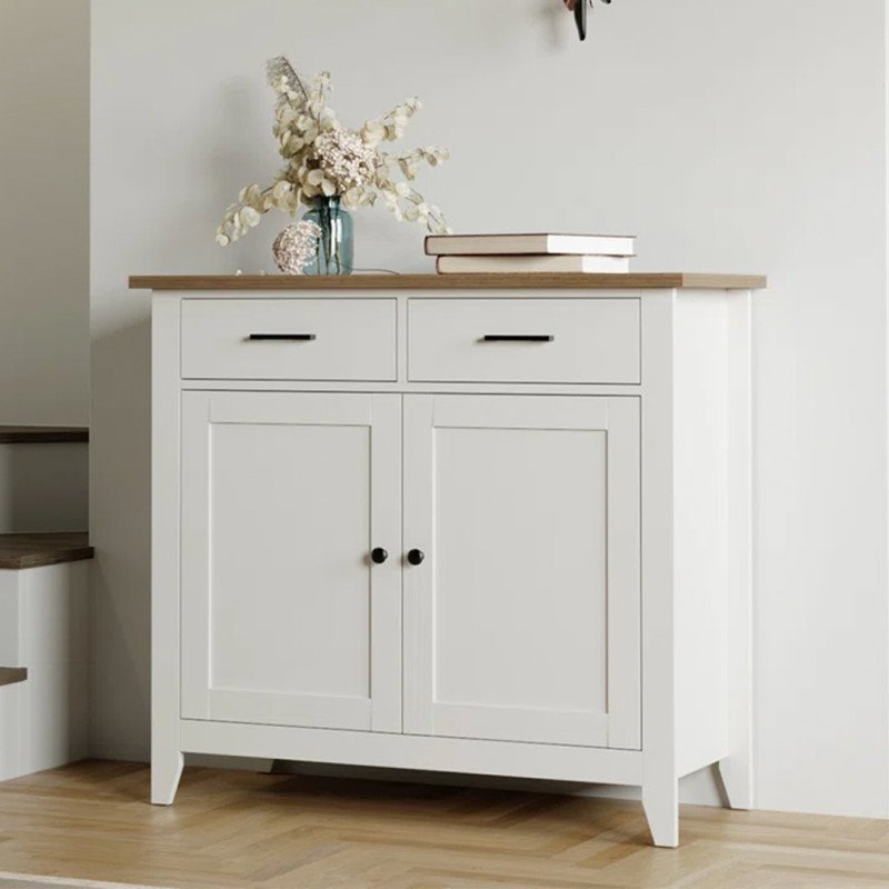 Der Schrank verfügt über zwei große Schubladen und einen Unterschrank, der von zwei Flügeltüren umgeben ist. Es ist in mehreren Farbvarianten erhältlich und der Rahmen besteht aus strapazierfähigem Holzwerkstoff. Mit einer Höhe von 32,3 Zoll hat es die perfekte Höhe, um bequem in einen Eingangsbereich, hinter ein Sofa oder zur Aufbewahrung in der Nähe Ihres Esstisches zu passen. Außerdem wiegt es im leeren Zustand weniger als 60 Pfund, sodass es relativ einfach zu transportieren ist, und es enthält sogar alle Werkzeuge, die Sie für den Zusammenbau benötigen.
