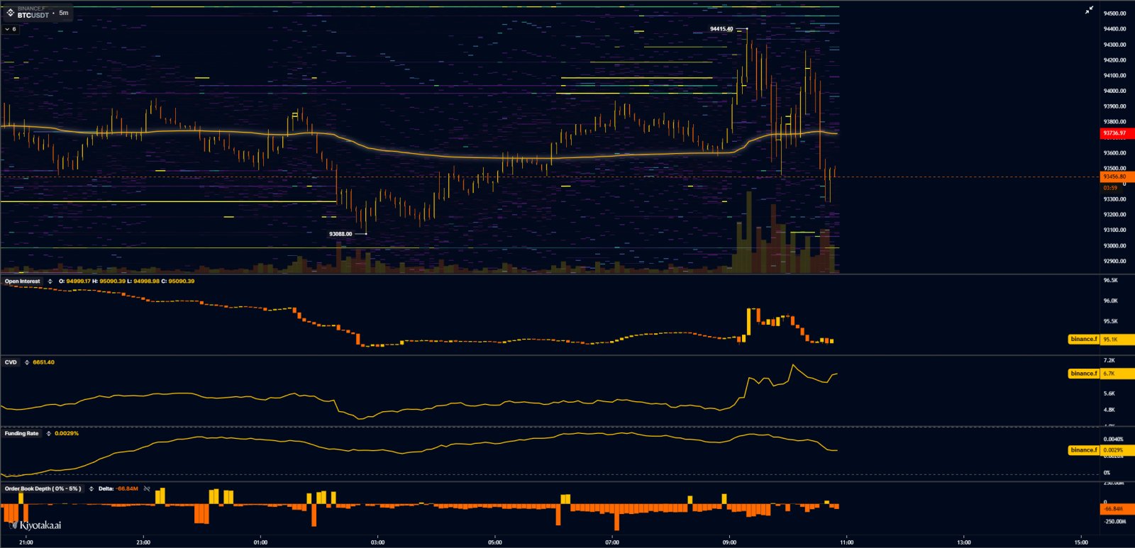„Long-Positionen erkennen den subtilen Hinweis um die 94.000 US-Dollar zum zweiten Mal und steigen aus der Positionierung aus, nur damit späte Shorts mit der Positionierung beginnen. Typischerweise gibt es an diesen Tagen viel Verfall“, schrieb er und fügte ein Diagramm mit Börsen-Orderbuchdaten hinzu.
