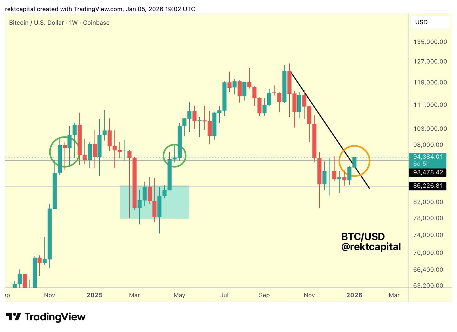 Das Paar musste nun die kommende wöchentliche Kerze über den Spannenhochs bei 93.500 $, dem jährlichen Eröffnungsniveau im Jahr 2025, schließen.