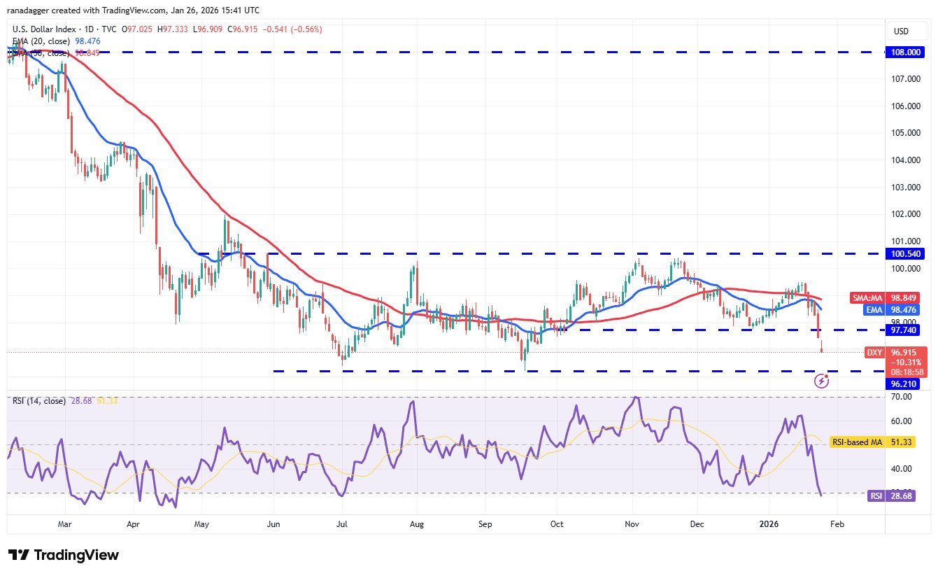 Der US-Dollar-Index (DXY) rutschte am Dienstag unter die gleitenden Durchschnitte und am Freitag unter die Unterstützung von 97,74.