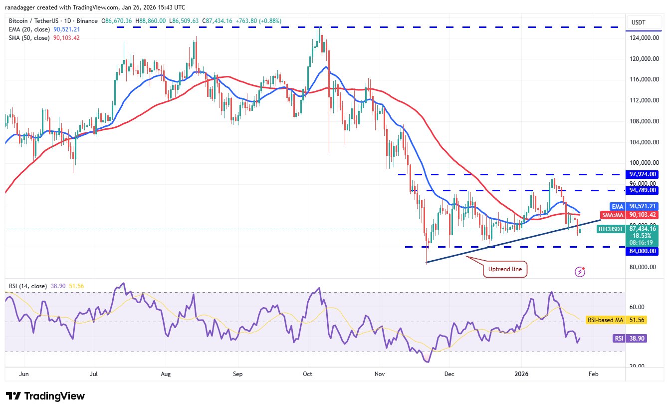BTC drehte am Freitag vom 20-Tages-EMA (90.521 $) nach unten und stürzte am Sonntag unter die Aufwärtstrendlinie.