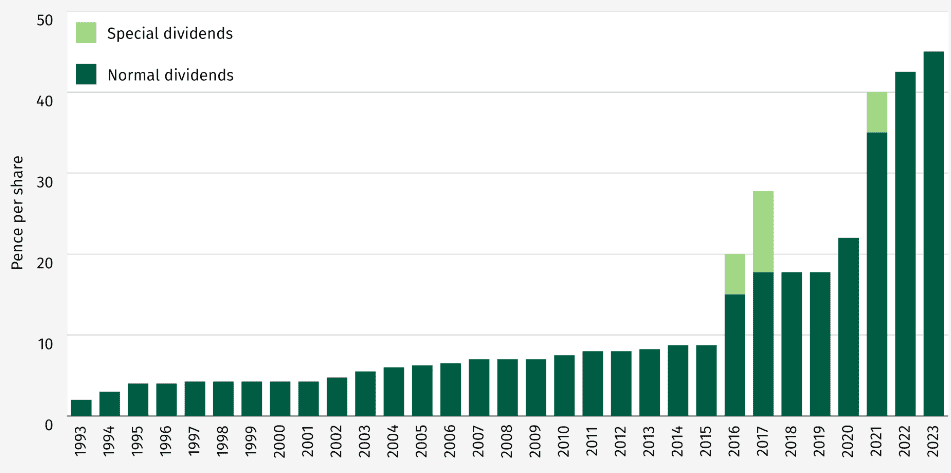 Das Unternehmen hat 1993 erstmals eine Dividende gezahlt. Seitdem hat es die Auszahlung jedes Jahr erhöht (oder beibehalten). In jüngerer Zeit – seit 2020 – ist es um eine durchschnittliche Jahresrate von 24,3%gewachsen.