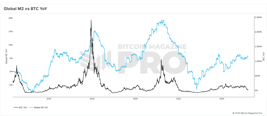 Während steigende Liquiditätsniveaus signifikant sind, betont Crosby, wie wichtig es ist, die Liquiditätsausdehnung zu überwachen, um Bitcoin -Preistrends vorherzusagen. Die M2-Wachstumsrate gegenüber dem Vorjahr bietet eine differenziertere Sicht auf die makroökonomische Dynamik. Obwohl die Liquidität im Allgemeinen zugenommen hat, hatte sich das Expansionstempo vorübergehend verlangsamt, bevor in den letzten Monaten einen Aufwärtstrend wieder aufgenommen wurde.