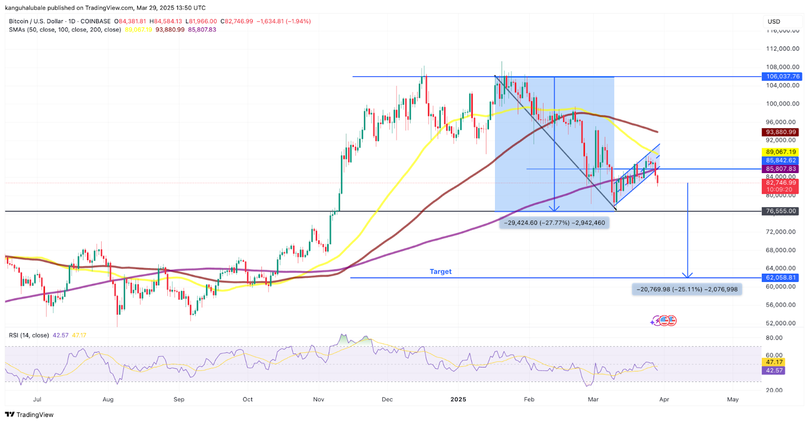 Das gemessene Bewegungsziel aus dem Muster deutet auf einen potenziellen Rückgang gegenüber 62.000 US -Dollar hin, was einen Rückgang von 25% gegenüber dem aktuellen Niveau entspricht.