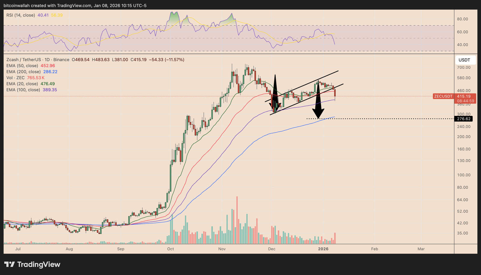 Simultaneously, ZEC’s price broke below a support confluence comprising a rising trendline and a 20-day exponential moving average (20-day EMA; the blue wave in the chart above).