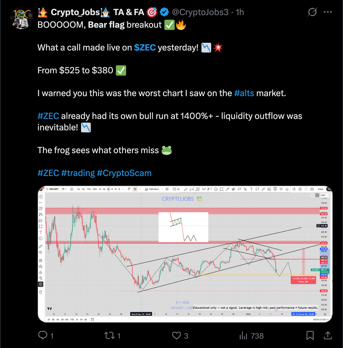 ZEC’s price can drop another 40-50% in the coming weeks, according to a technical setup shared by analyst Osemka.