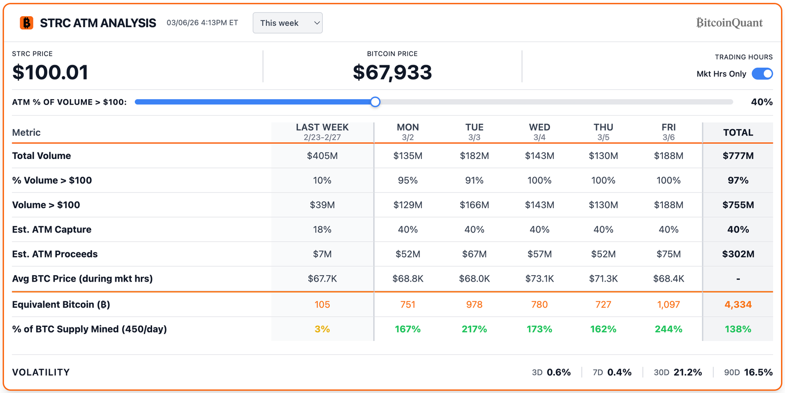 Die Prognose basiert auf der Handelsaktivität von STRC in dieser Woche. Das Modell von BitcoinQuant zeigt ein Gesamtvolumen von etwa 777 Millionen US-Dollar, wobei etwa 97 % oder 755 Millionen US-Dollar über dem Nennwert der Aktie von 100 US-Dollar gehandelt wurden.