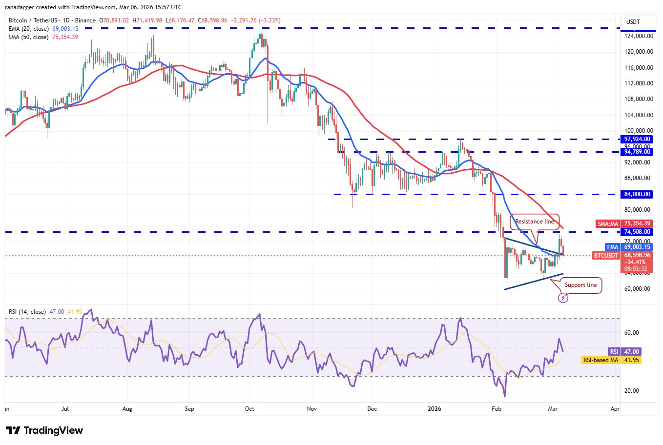 Der exponentielle gleitende 20-Tage-Durchschnitt (69.003 USD) ist die entscheidende Unterstützung, auf die man auf der Abwärtsseite achten sollte. Wenn der Bitcoin-Preis über dem 20-Tages-EMA steigt, werden die Bullen erneut versuchen, das Hindernis bei 74.508 US-Dollar zu überwinden. Wenn es ihnen gelingt, könnte das BTC/USDT-Paar auf 84.000 US-Dollar steigen. Eine solche Bewegung deutet darauf hin, dass das Paar möglicherweise seinen Tiefpunkt bei 60.000 US-Dollar erreicht hat.