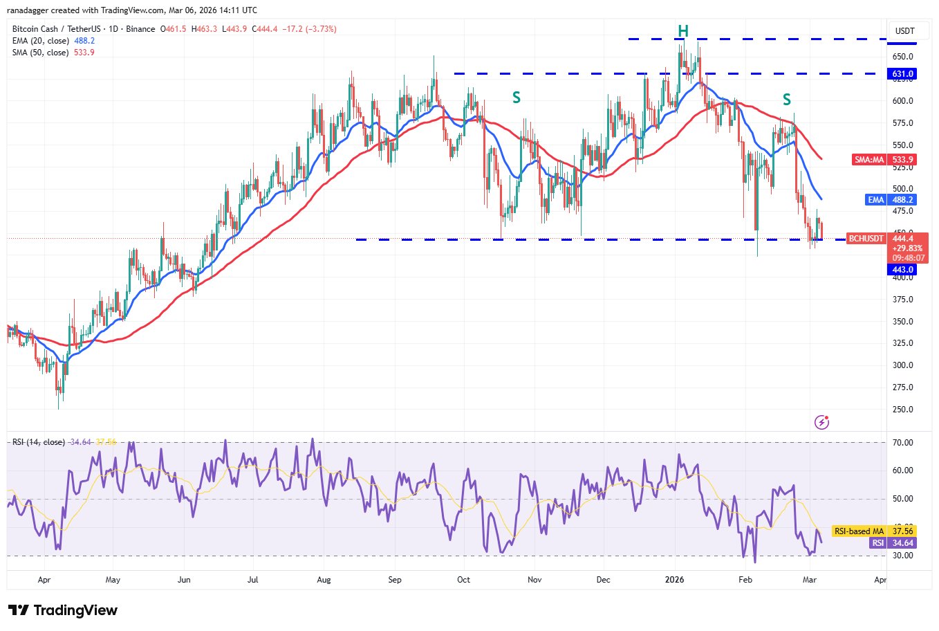 Die Bären werden versuchen, ihre Position zu stärken, indem sie den Bitcoin Cash-Preis unter die Unterstützung von 443 $ ziehen. Wenn ihnen das gelingt, wird das BCH/USDT-Paar ein rückläufiges Kopf-Schulter-Muster vollenden. Das Paar könnte dann auf 375 US-Dollar fallen.