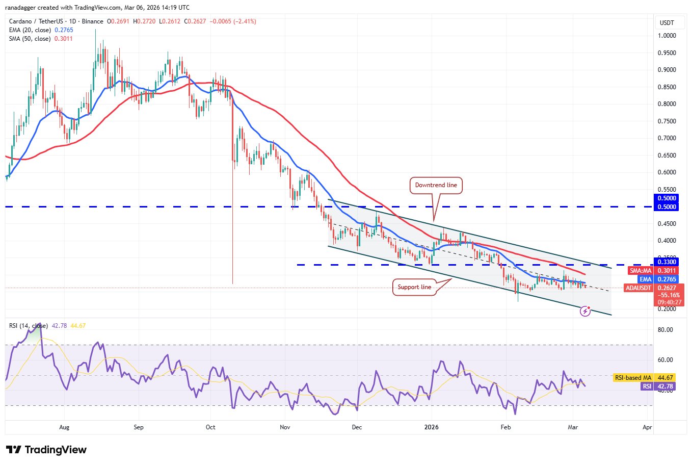 Ein kleiner Vorteil zugunsten der Bullen besteht jedoch darin, dass sie nicht zugelassen haben, dass der Cardano-Preis unter die 0,25-Dollar-Marke fällt. Wenn der Preis vom aktuellen Niveau oder der 0,25-Dollar-Unterstützung steigt, werden die Bullen erneut versuchen, das ADA/USDT-Paar auf die Abwärtstrendlinie des absteigenden Kanalmusters zu drücken.