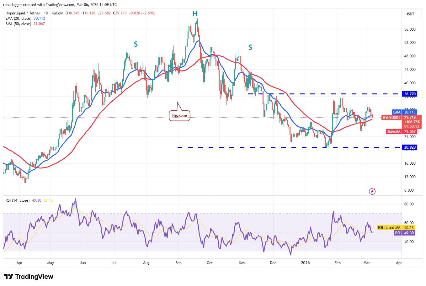 Wenn der Hyperliquid-Preis kräftig von den gleitenden Durchschnitten abprallt, werden die Bullen erneut versuchen, das HYPE/USDT-Paar auf den Überkopfwiderstand von 36,77 $ zu drücken. Ein Schlusskurs oberhalb der 36,77-Dollar-Marke signalisiert den Beginn einer neuen Aufwärtsbewegung.