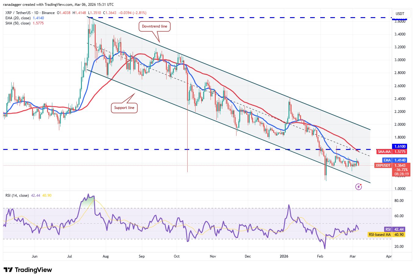 XRP (XRP) schloss am Mittwoch über dem 20-Tage-EMA (1,41 USD), aber die Bullen konnten die höheren Niveaus nicht halten.