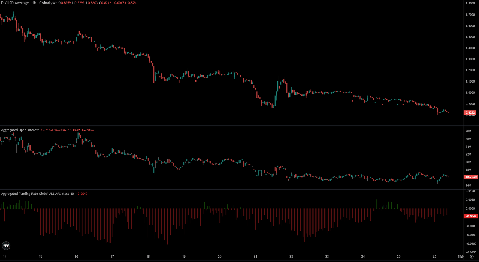 Das offene Interesse war in den letzten vier Tagen flach. Die Marktteilnehmer schienen sich damit zufrieden zu geben, im Rahmen des stetigen Abwärtstrends der Pi festzuhalten.