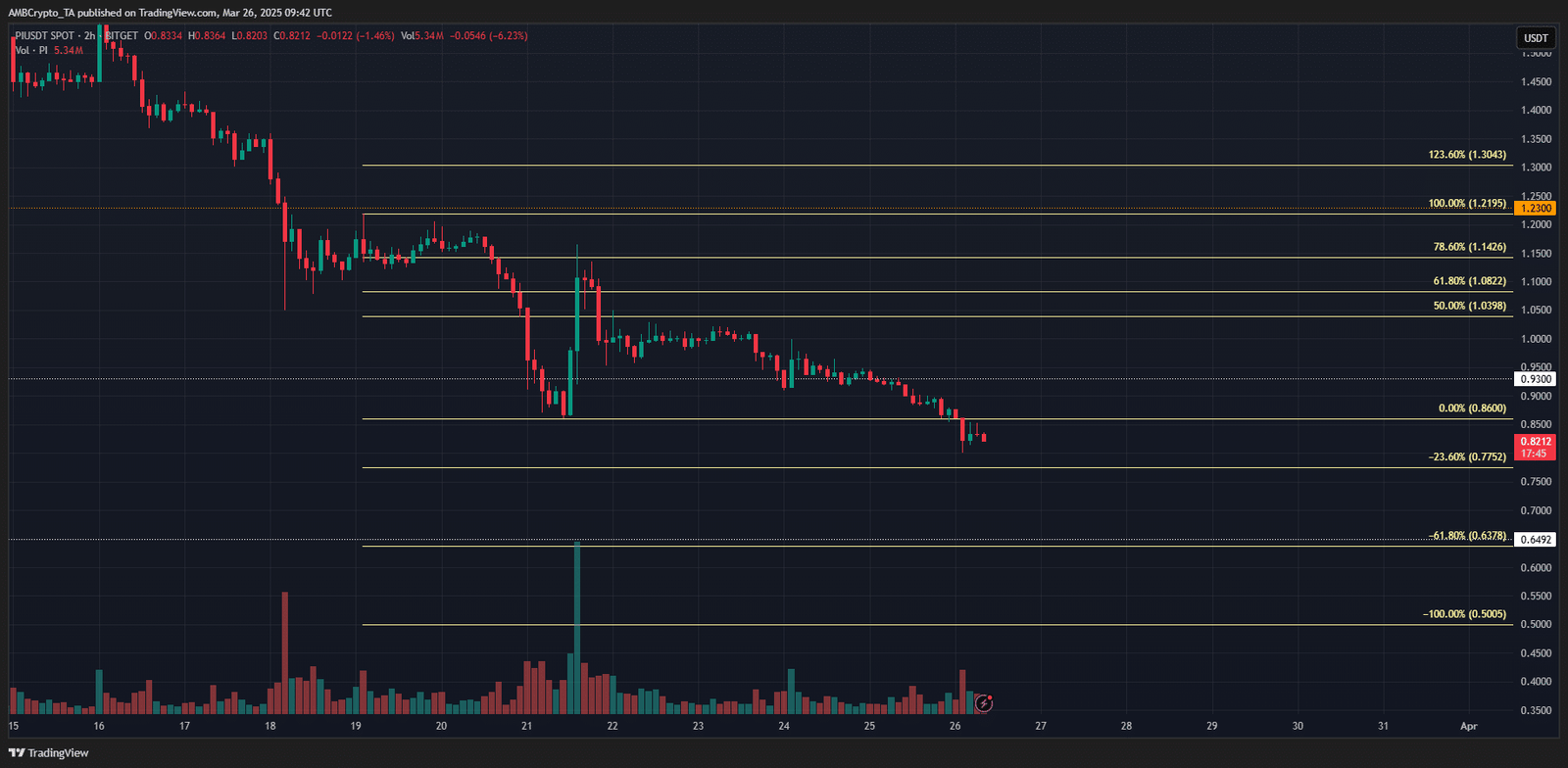 Der Preissprung am 21. März erwies sich als Ablehnung des Retracement -Niveaus von 78,6% bei 1,14 USD. Seitdem war PI um 28,38%gesunken und ist ebenfalls unter 0,86 US -Dollar gerutscht.