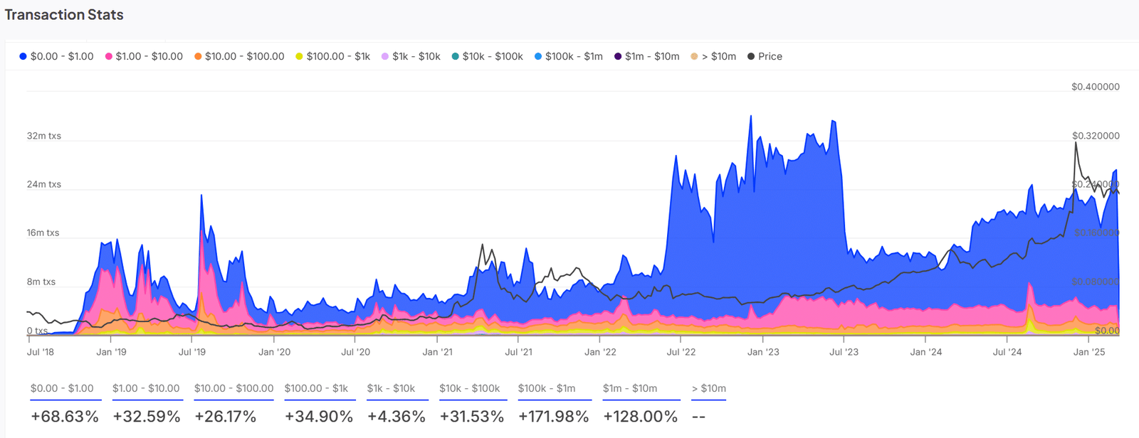 Wenn man das Transaktionsvolumen von TRX betrachtet, ist ein Anstieg in größeren Trades zu sehen. Z. B. im Bereich von 100.000 US -Dollar. Dieses wachsende Interesse größerer Anleger wie Wale und Institutionen könnte darauf hinweisen, dass sich die Marktteilnehmer auf potenzielle Volatilität vorbereiten.