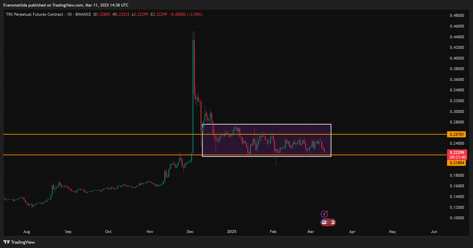 Tron konsolidiert seit Ende Dezember innerhalb eines rechteckigen Bereichs, wobei die Preisaktion zwischen 0,2185 USD und 0,25701 US -Dollar abprallt. Zum Zeitpunkt des Schreibens testete TRX seine Unterstützungszone auf 0,2185 US -Dollar, und dieses Niveau wäre entscheidend für die Bestimmung des nächsten Zuges.