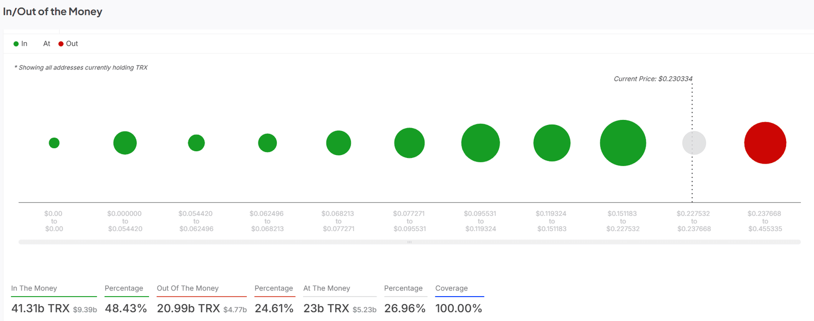 Zum Zeitpunkt der Presse war ein erheblicher Teil der Tron -Inhaber „im Geld“, wobei 48,43% der Adressen 41,31 Milliarden TRX im Wert von 9,39 Milliarden US -Dollar enthielten. Dies bedeutete, dass der Preis für viele Investoren günstig zu sein schien und auf diesen Ebenen Unterstützung bot.