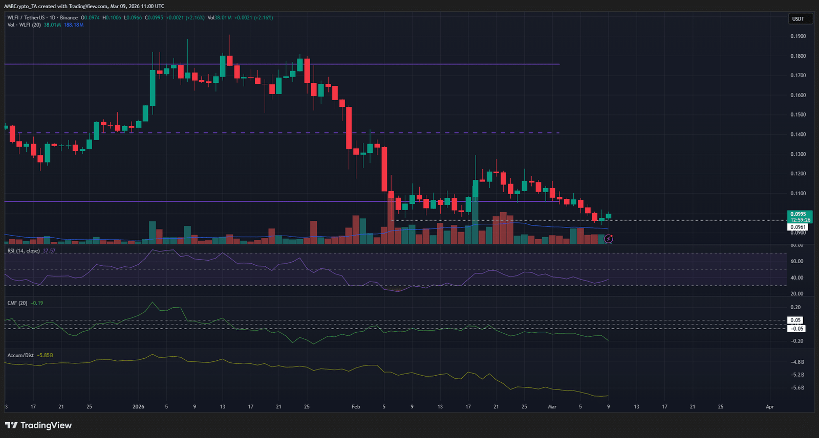 Dieses Tief blieb bestehen. Der CMF liegt seit zwei Wochen unter -0,05 und der A/D tendiert im gesamten Jahr 2026 nach unten. Trotz dieses starken Verkaufsdrucks wurde die Unterstützung von 0,096 $ noch nicht durchbrochen.