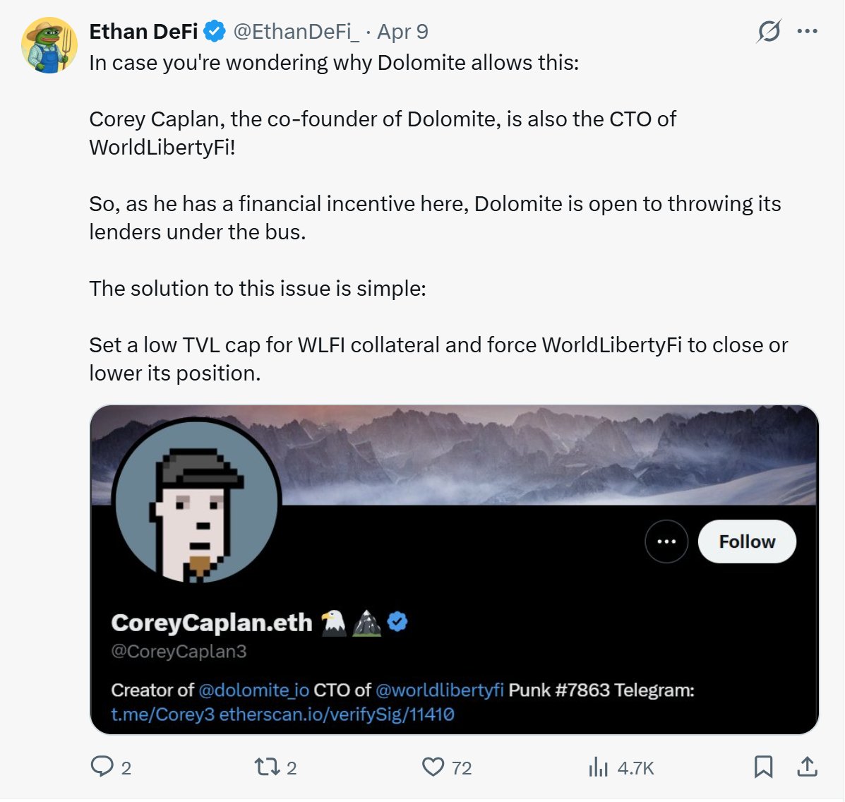 Die große Sicherheitenposition hat bei DeFi-Analysten Bedenken geweckt, die warnen, dass sie Risiken für Kreditgeber auf Dolomite mit sich bringen könnte, wenn der Preis von WLFI fällt und sich dem Liquidationsniveau nähert.
