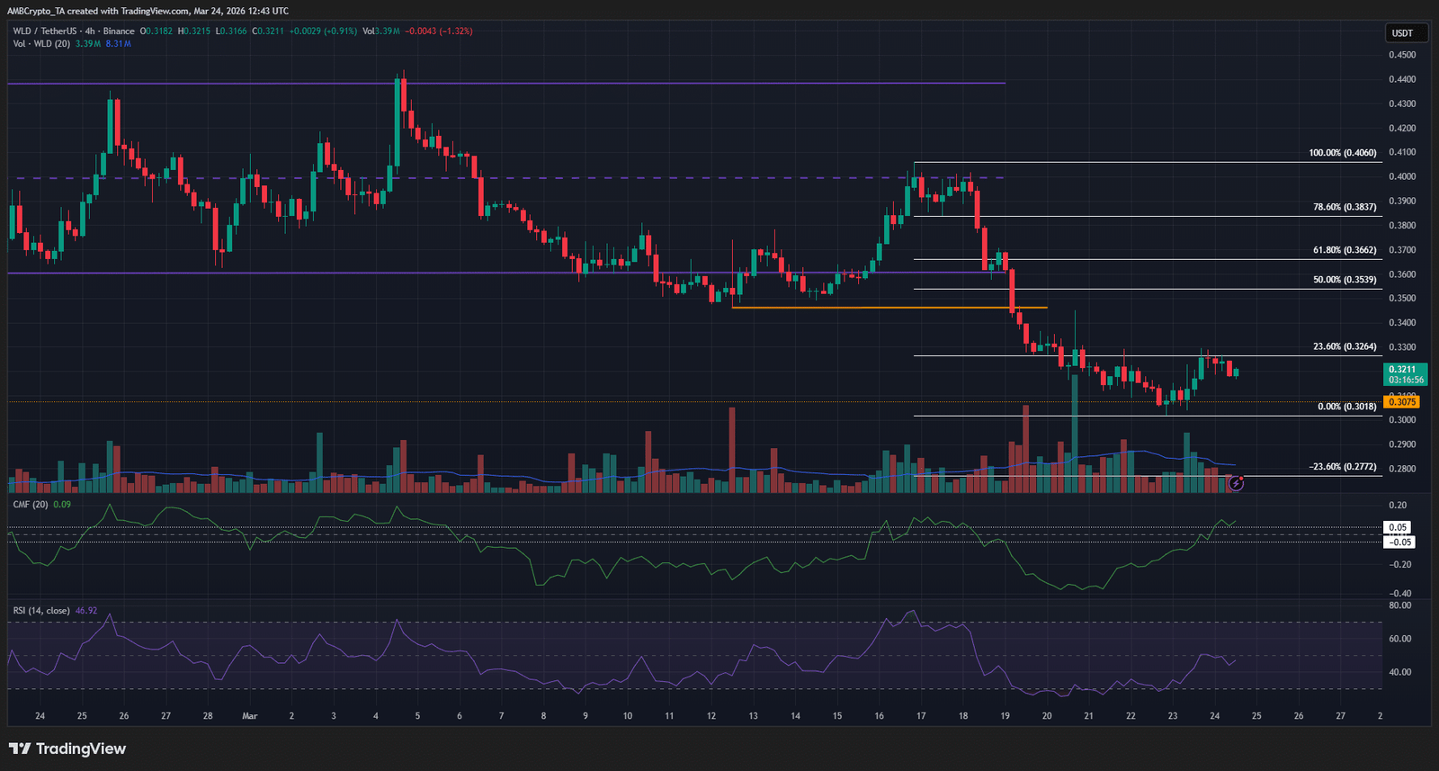 Weltmünze [WLD] verzeichnete am Montag, dem 23. März, einen starken Aufwärtstrend. Käufer verteidigten die Unterstützung von 0,3075 US-Dollar vom 6. Februar und erzwangen eine Erholung um 8,46 % vom Tagestief bei 0,3039 US-Dollar.