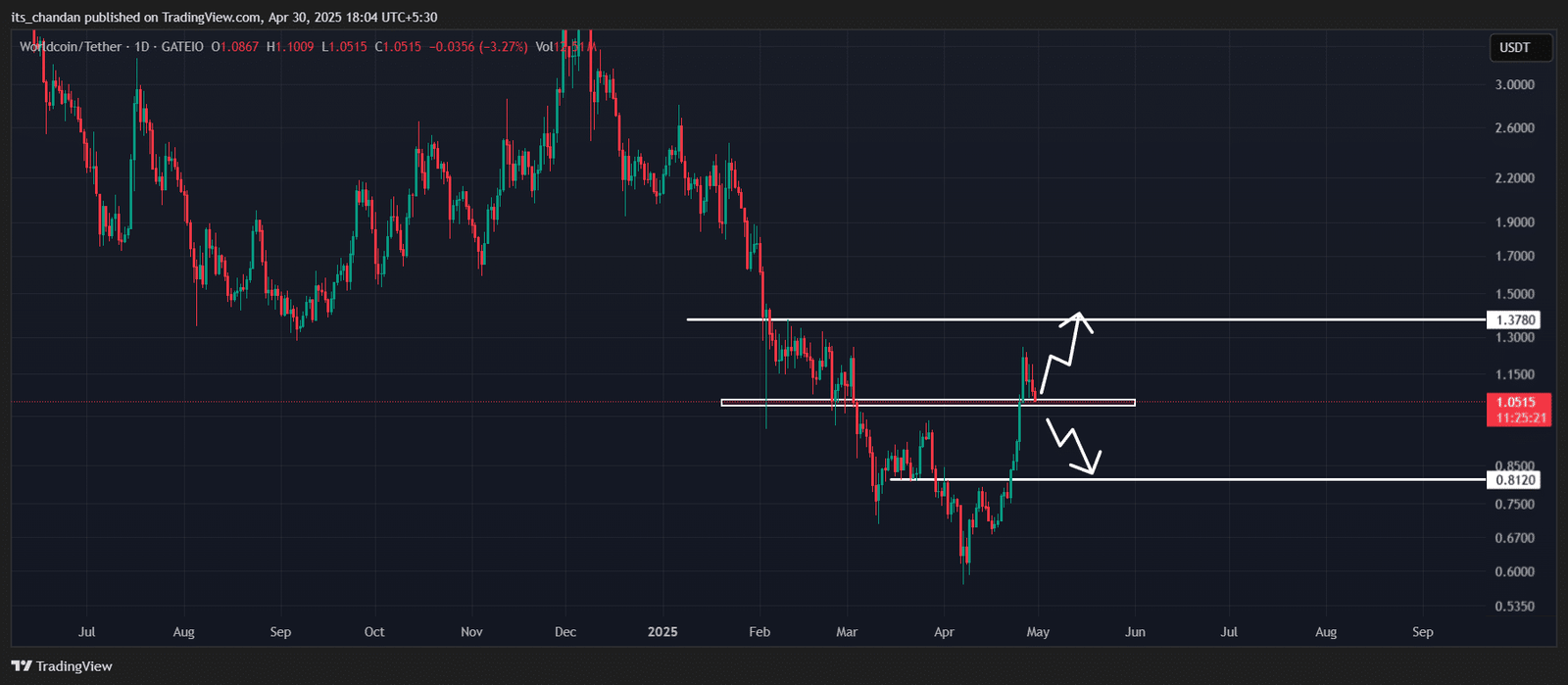 - Worldcoin könnte 25% auf 1,35 US -Dollar sammeln, wenn es Unterstützung auf 1,05 USD bietet.
