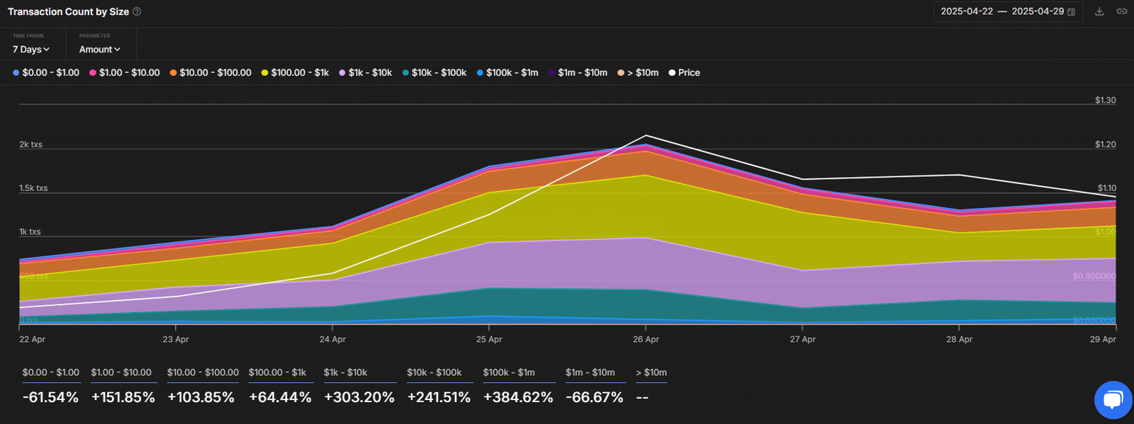 In der Zwischenzeit zeigt eine weitere Onkain-Metrik von Intotheblock, dass Waltransaktionen im Wert von 100.000 und 1 Million US-Dollar um 384%gestiegen sind.