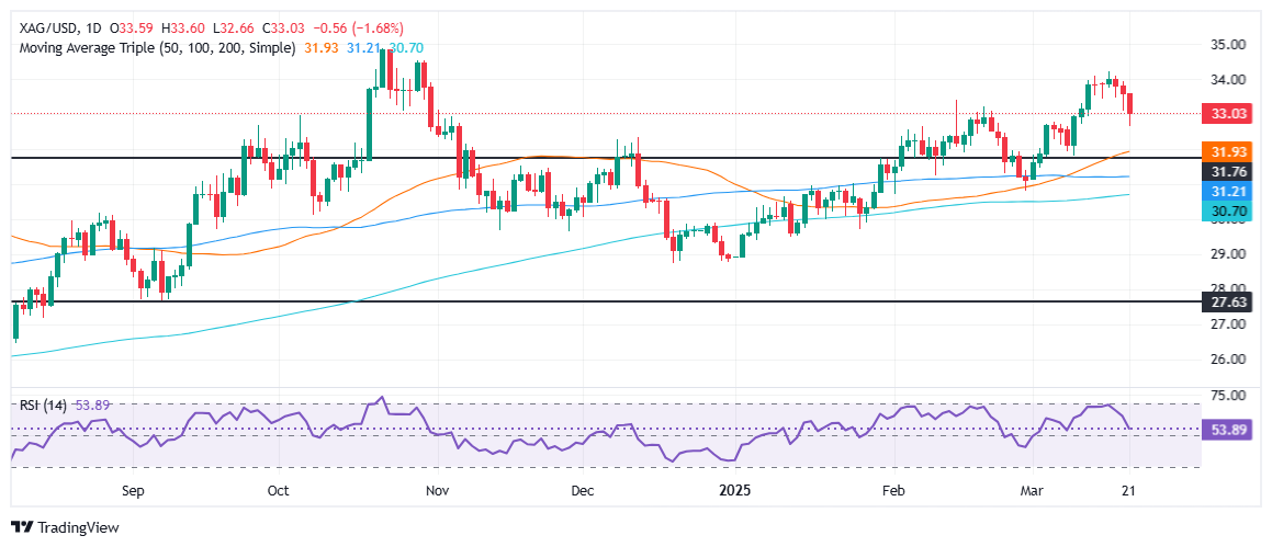 Die Silberpreise fielen spät in der nordamerikanischen Sitzung und erreichten ein wöchentliches Tief unter 33,00 USD und erhalten seinen größten Verlust seit dem 25. Februar 2025. Zum Zeitpunkt des Schreibens traten XAG/USD mit 33,03 USD, um mehr als 1,6%zurück, die einer starken verantwortlich gemacht wurden und einer starken verantwortlich gemacht wurden. US -Dollar (USD) und erhöhte US -Erträge.