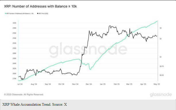 In der Zwischenzeit bleibt der Preis von XRP bestehen stagnierenDie großen Inhaber füllen sich. Laut jüngsten Statistiken gibt es jetzt mehr als 300.000 Adressen, die mindestens 10.000 XRP enthalten. Dies ist eine Erhöhung von rund 281.000 ab Dezember 2024. Die Whale -Geldbörsen steigen weiter, obwohl der Preis weitgehend rund 2,20 USD bleibt.